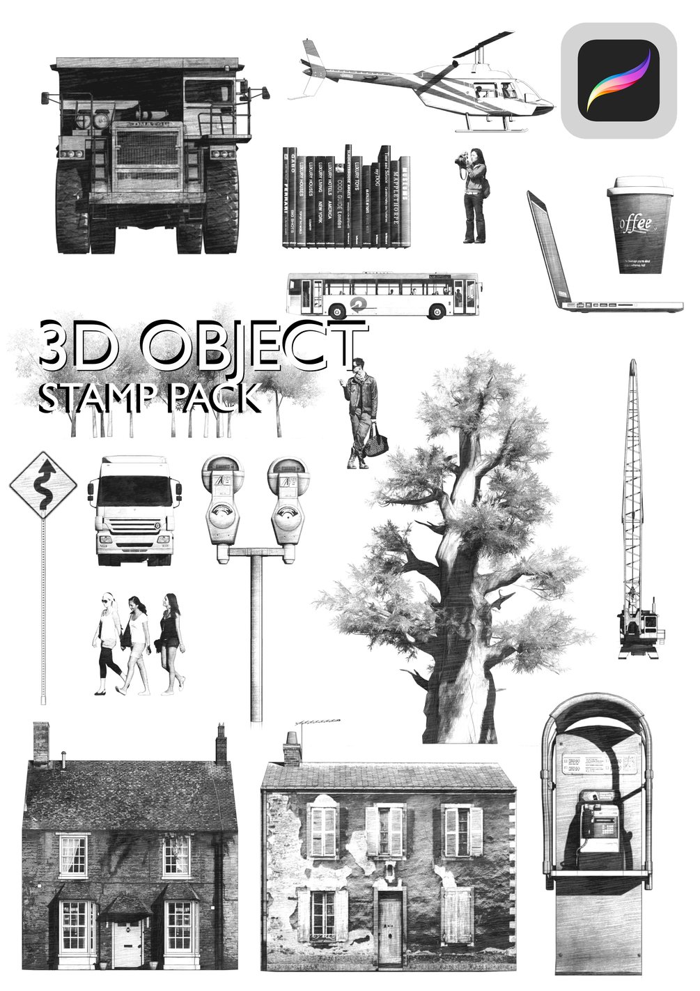 The Procreate 3D Stamp Pack contains the necessary tools to turn your procreate app into a high quality drawing suite for Procreate for iPad, iPad Pro and iPhone.